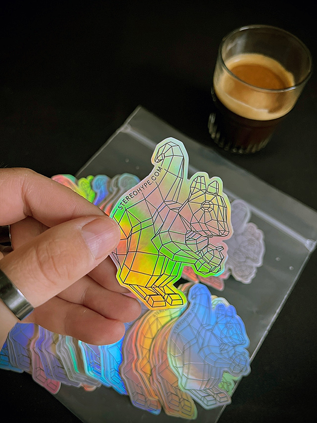 Yay! The new batch of holographic Stereohype stickers is here. We’ll put some aside for the this year's Illustrators' Winter Fair in London where we will once again have a colourful stand with button badges and print goodies.